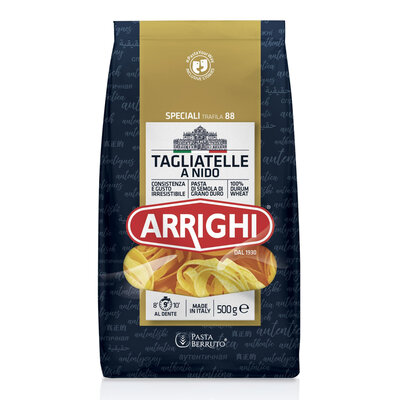 Arrighi Tagliatelle is een klassieke Italiaanse pastavorm met lange, platte linten. Gemaakt van hoogwaardige durumtarwe, heeft deze pasta een zachte textuur en een heerlijke smaak. De tagliatelle is perfect om te combineren met diverse sauzen, van romige Alfredo tot pittige bolognese. Geniet van een authentiek Italiaans gerecht met Arrighi Tagliatelle.