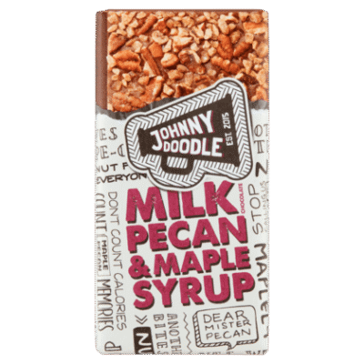 Johnny Doodle Love Milk Pecan & Maple Syrup: Een liefdevolle traktatie om van te genieten. Deze Johnny Doodle Love Milk Pecan & Maple Syrup combineert romige melkchocolade met knapperige pecannoten en de rijke zoetheid van ahornsiroop. Laat je verleiden door de harmonie van smaken en de heerlijke textuur. Een verrukkelijke traktatie die liefde en genot samenbrengt in elke hap.