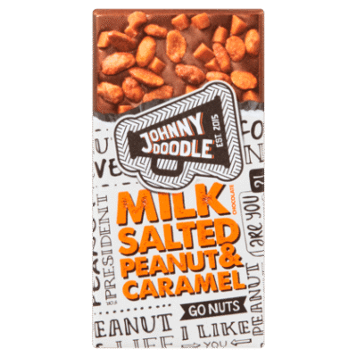 Johnny Doodle Milk Salted Peanut & Caramel: Een onweerstaanbare chocoladereep die je smaakpapillen verrast. Geniet van de romige melkchocolade gecombineerd met knapperige pinda’s en een vleugje zeezout. De toevoeging van smeuïge karamel maakt deze traktatie compleet. Een perfecte balans tussen zoet, zout en knapperigheid. Laat je verwennen door Johnny Doodle Milk Salted Peanut & Caramel.