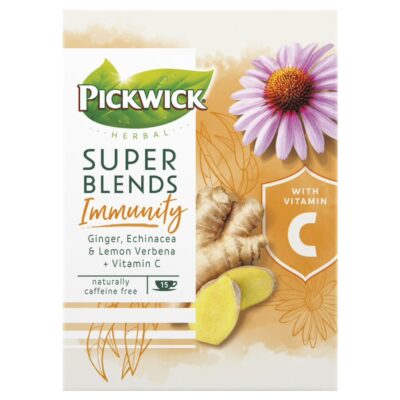 Versterk je weerstand met Pickwick Super Blends Immunity. Deze krachtige mix van groene thee, echinacea en vlierbloesem helpt je je immuunsysteem te ondersteunen. Geniet van de weldadige en beschermende eigenschappen van deze thee, perfect voor een moment van versterking en welzijn.
